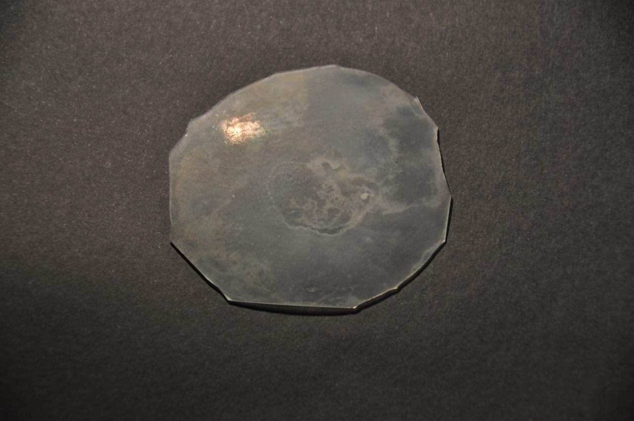 Greenish colourless glass; slightly convex with chipped edges. Eboracum describes this grave group and the circumstances of the find: "Coffin and grave goods, found in 1901 at the N end of Sycamore Terrace, about 2ft from the S boundary wall of Love Lane (NG 5968 5236). The stone coffin, with a ridged lid, already broken into three pieces when found, contained the skeleton of a woman 5ft 4ins. tall lying on her back. The grave goods H5 -12, consisted of a dark blue glass flagon with applied threads on the neck, an open work inscription in bone, SOROR AVE VIVAS IN DEO "Hail sister, may you live in God" two jet bangles, a bracelet of blue glass beads, fragments of five bone bracelets, silver and bronze lockets, two yellow glass ear-drops, two marbled glass beads, and a small round glass mirror. This burial is often described as Christian."