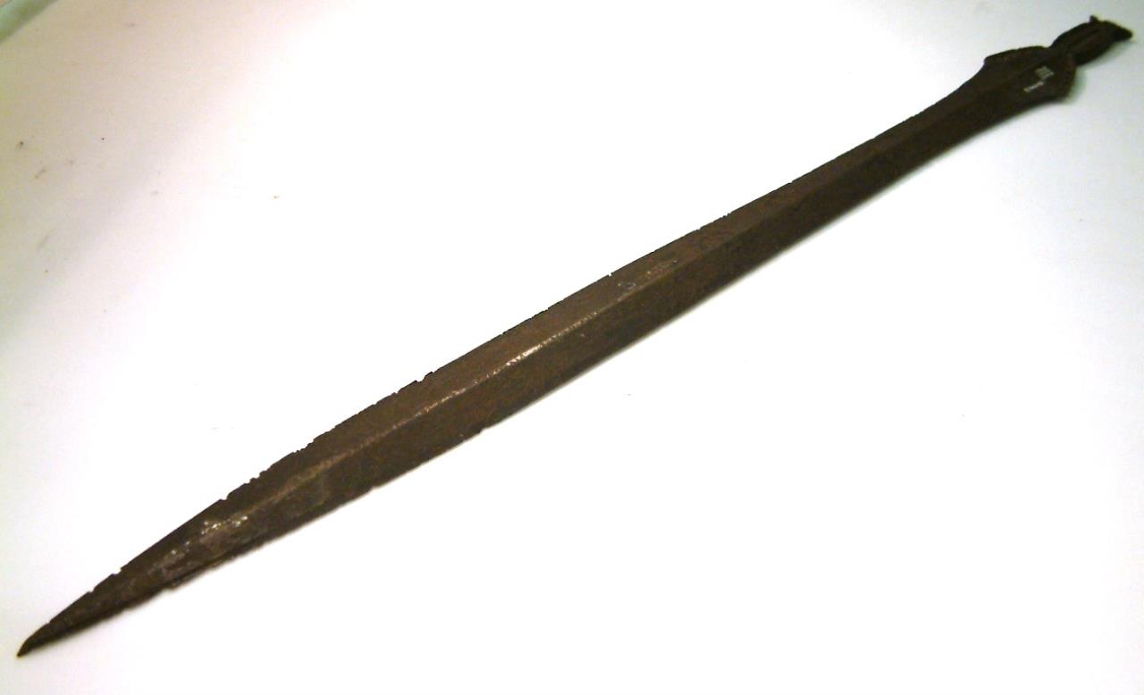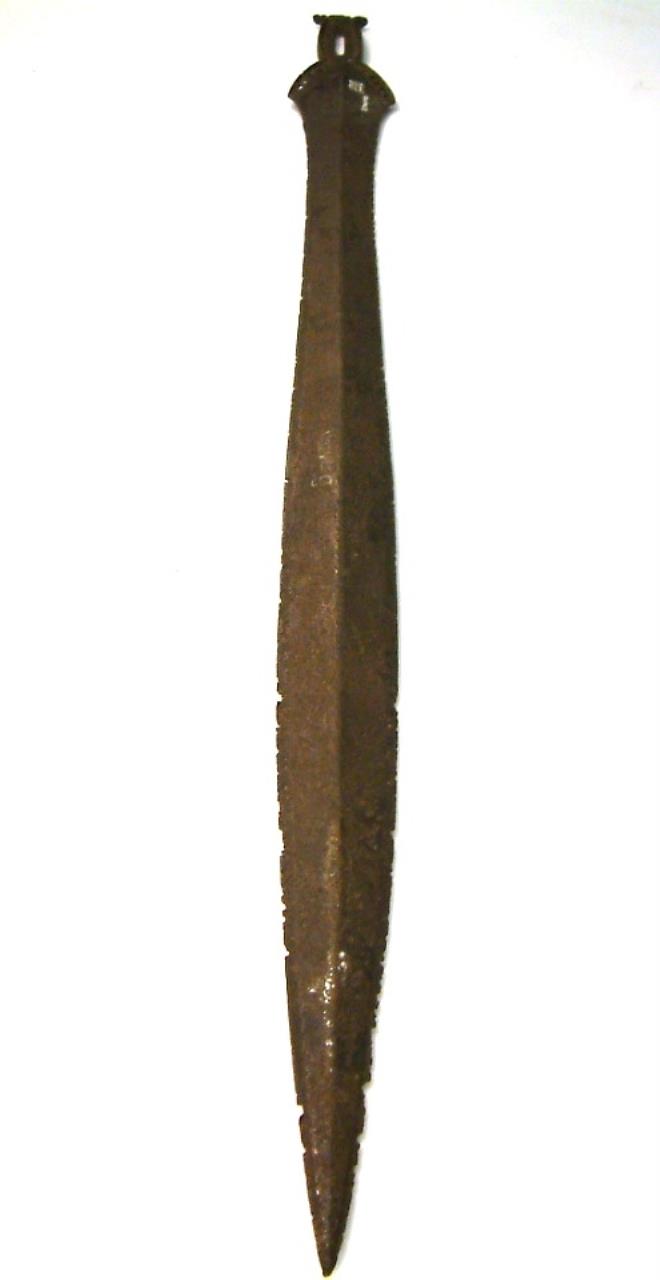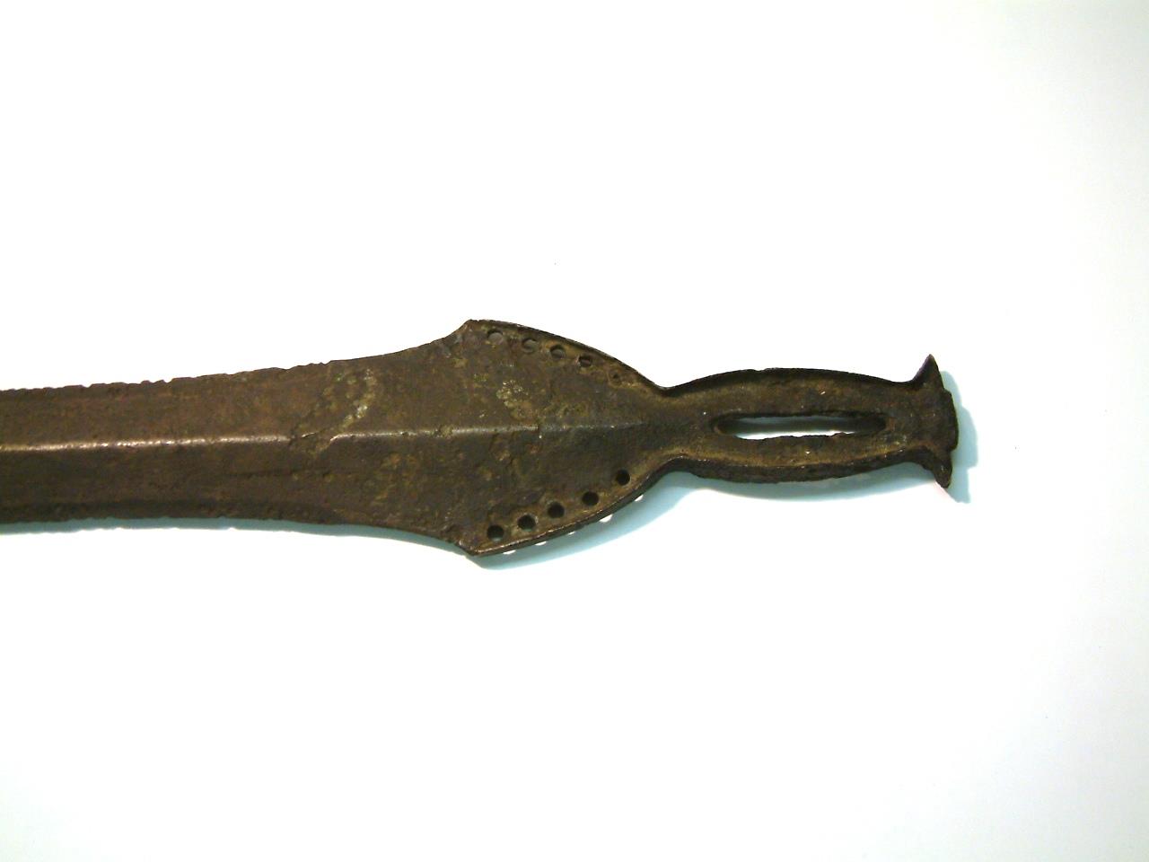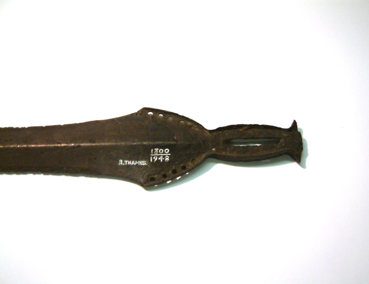 Leaf-shaped blade, T-shaped handle, balance point approximately half way up the sword, 10 empty rivet holes present, small handle, gap in the centre of the tang. The tang is corroded, one rivet hole is blocked but otherwise the blade seems in good condition despite notches in the cutting edges. The blade has a raised central keel with indented cutting edges. The grip has a raised lip around its edge but this does not continue to the top of the pommel which appears to be missing above the T shape of the hilt.The tip of the blade is still sharp.