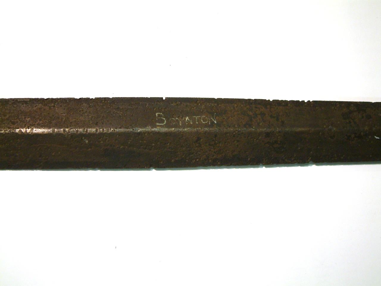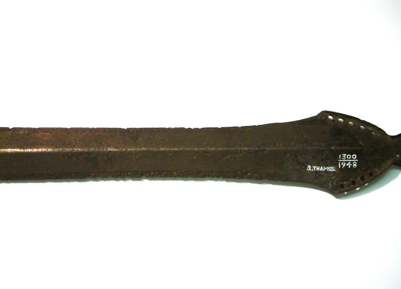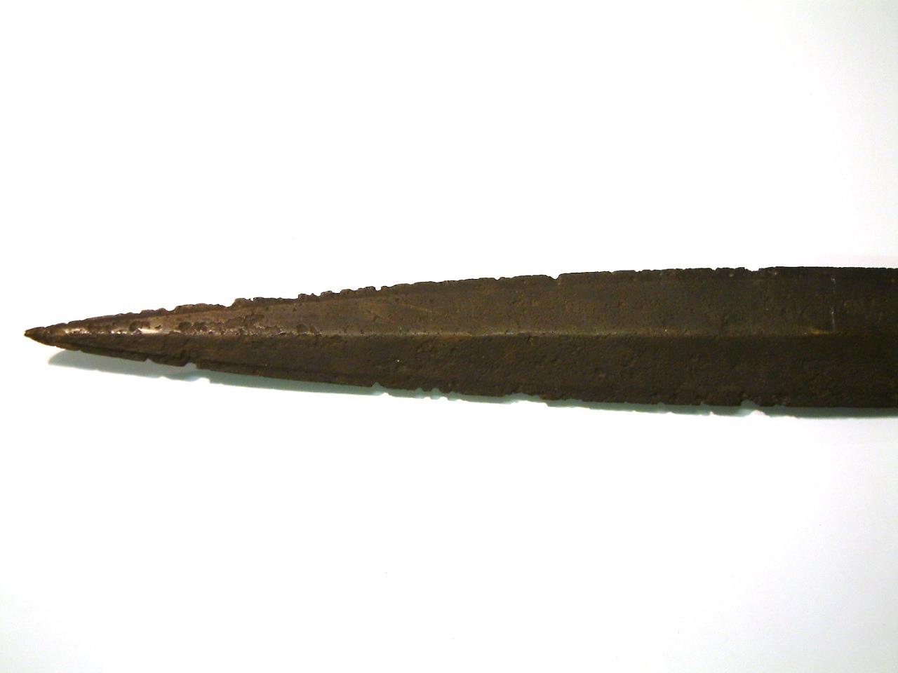 Leaf-shaped blade, T-shaped handle, balance point approximately half way up the sword, 10 empty rivet holes present, small handle, gap in the centre of the tang. The tang is corroded, one rivet hole is blocked but otherwise the blade seems in good condition despite notches in the cutting edges. The blade has a raised central keel with indented cutting edges. The grip has a raised lip around its edge but this does not continue to the top of the pommel which appears to be missing above the T shape of the hilt.The tip of the blade is still sharp.