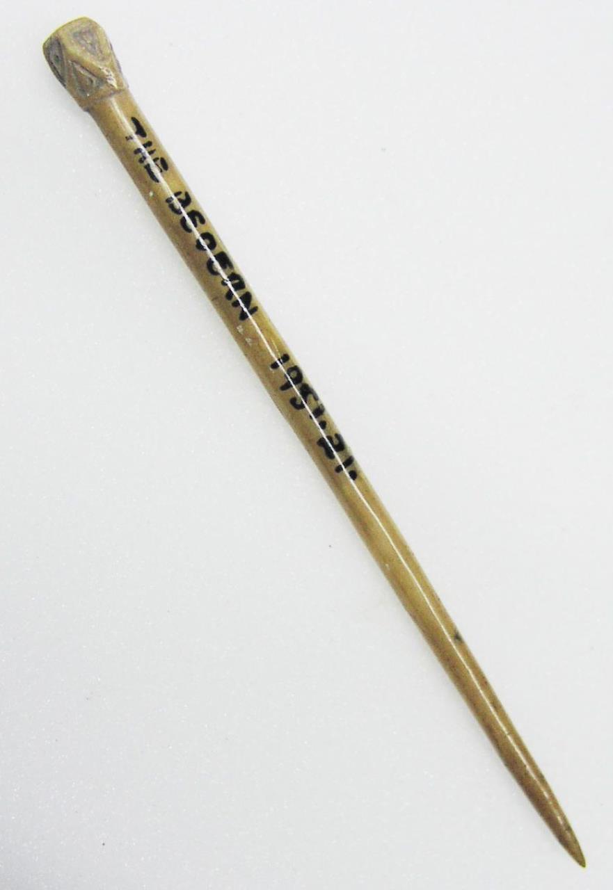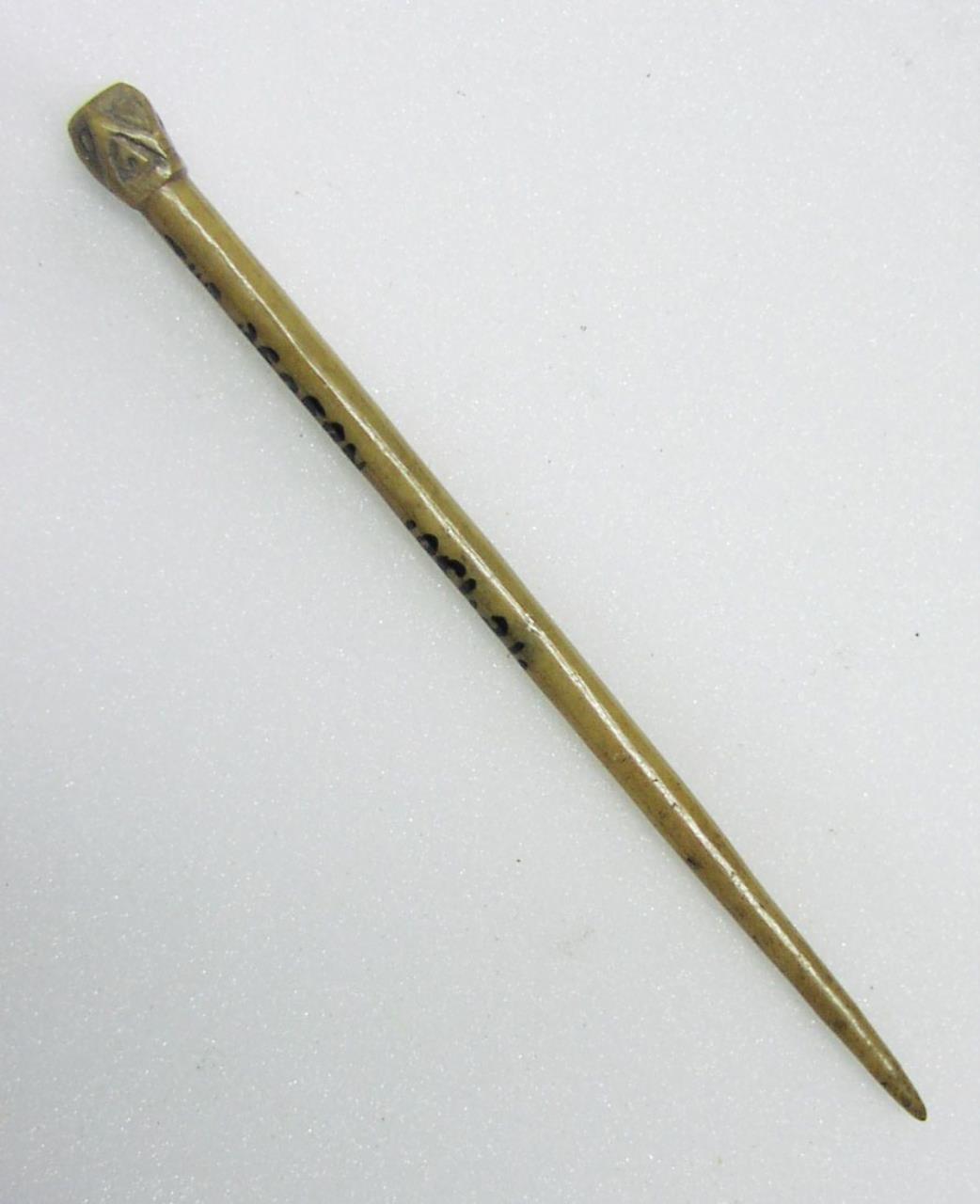 Faceted head with incised triangles. Waterman 1959 "Bone pin; faceted head with roughly incised triangle, enclosing a single dimple, to each face. Single dimple on flat top."
