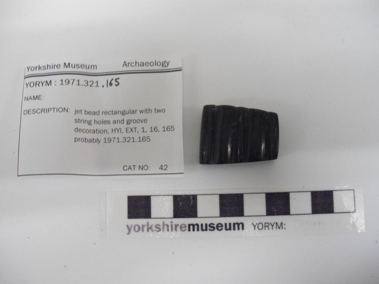 - Flat, trapezoidal bead with deep transverse grooves across the face. Pierced laterally by two holes, one of which has worn through at the edge.