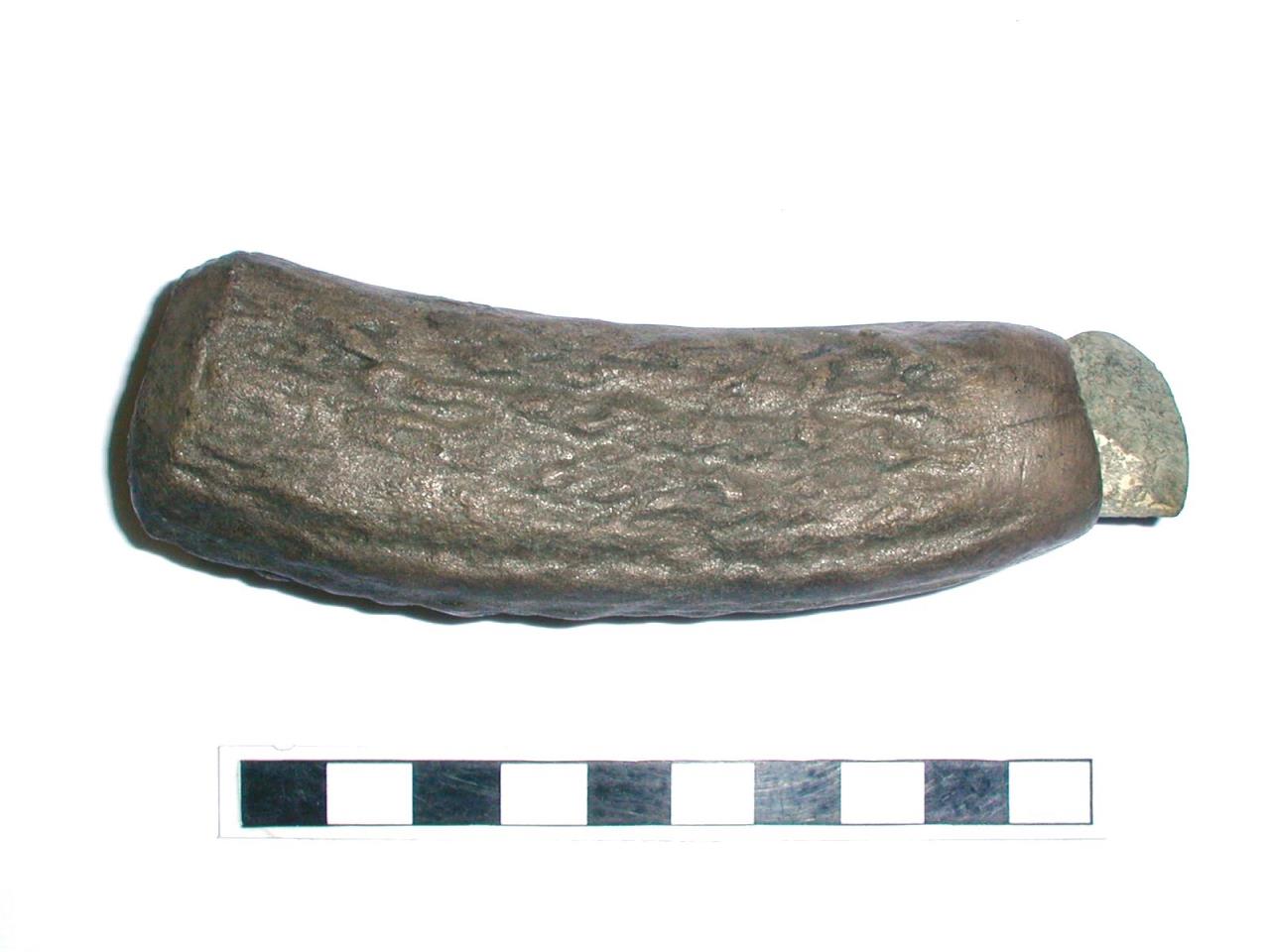 Miniature ground and polished stone axe, with an antler sleeve. Stone and antler currently separated. Axe has straight sides tapering towards the butt; cutting edge curved; butt straight; oval section.