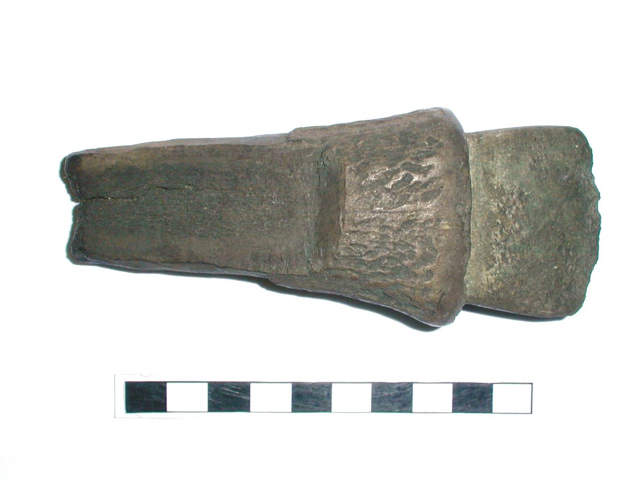 Edge ground and polished stone axe, with an antler sleeve. Axe has sides tapering towards the butt; cutting edge almost straight; butt not visible; oval section, with flattened sides.
