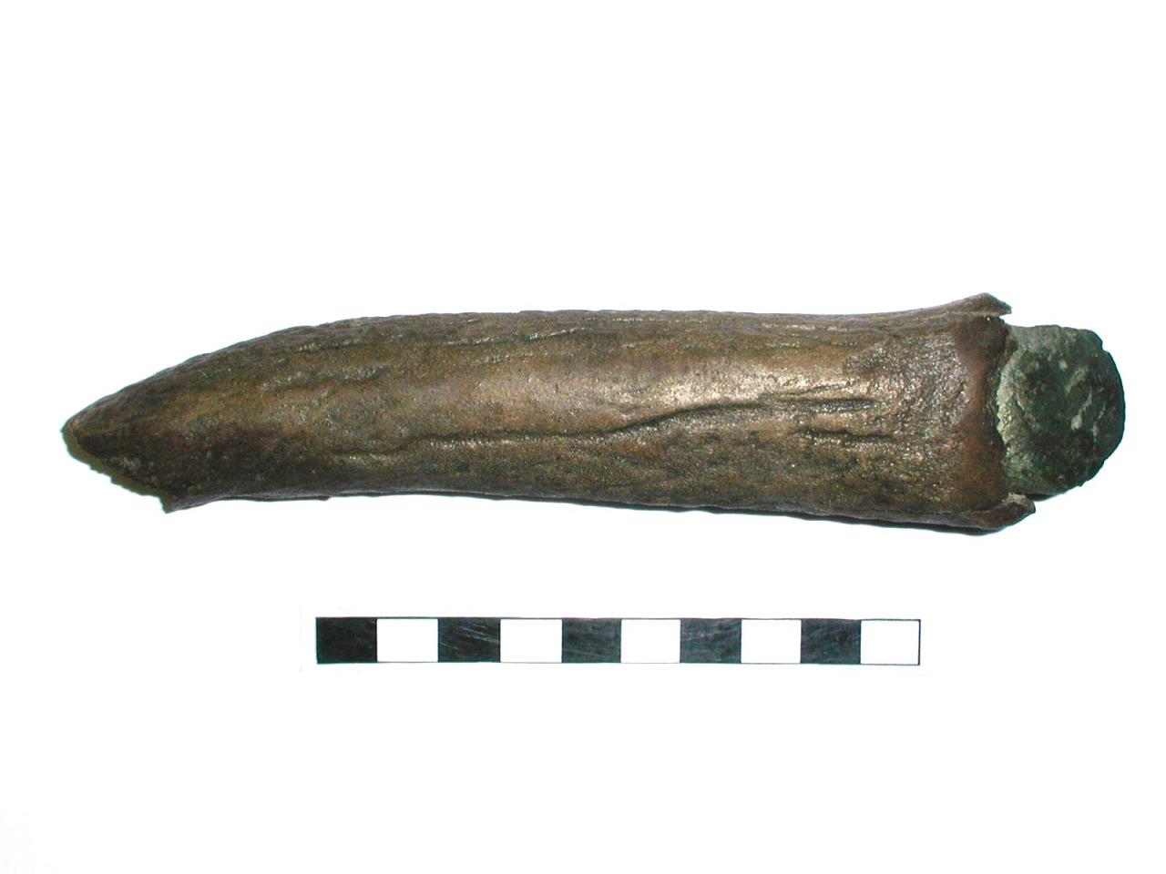 Edge ground and polished stone axe,with an antler sleeve. Axe has sides tapering towards the butt; cutting edge curved; butt not visible; oval section.
