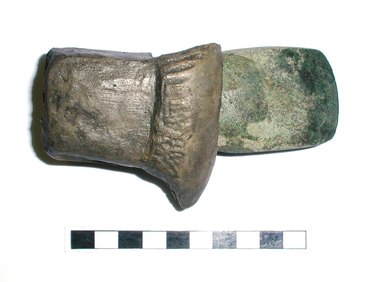 Ground and polished stone axe, with an antler sleeve. Stone and antler currently separated. Axe has sides tapering towards the butt; cutting edge curved; butt rounded; almost rectangular section.