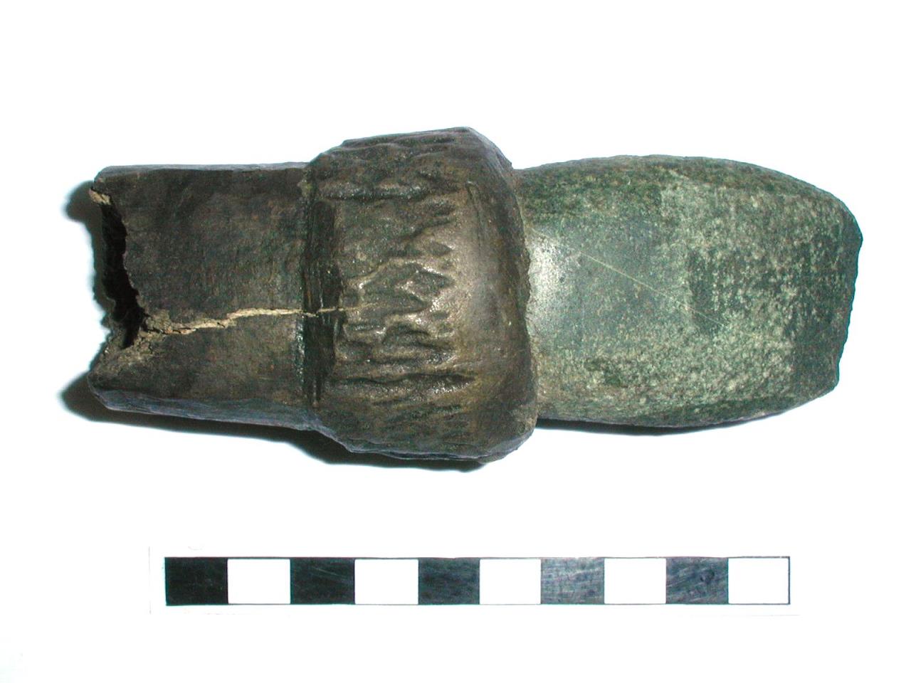 - Ground and polished stone axe,with an antler sleeve. Axe has sides tapering towards the butt; cutting edge straight; butt not visible; oval section.