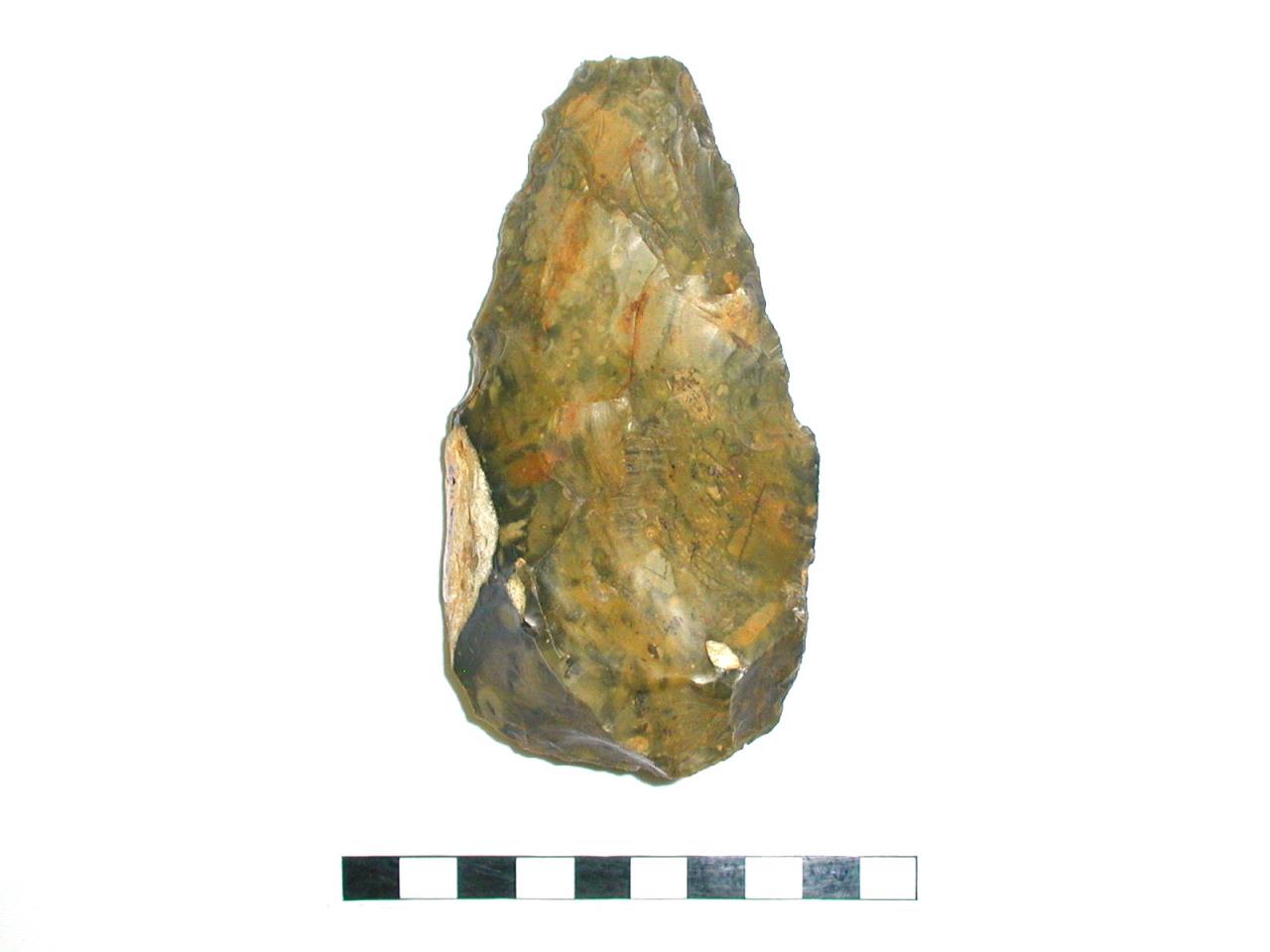 Pointed handaxe, with bifacial flaking. Slightly rolled condition, with slight ocherous staining.