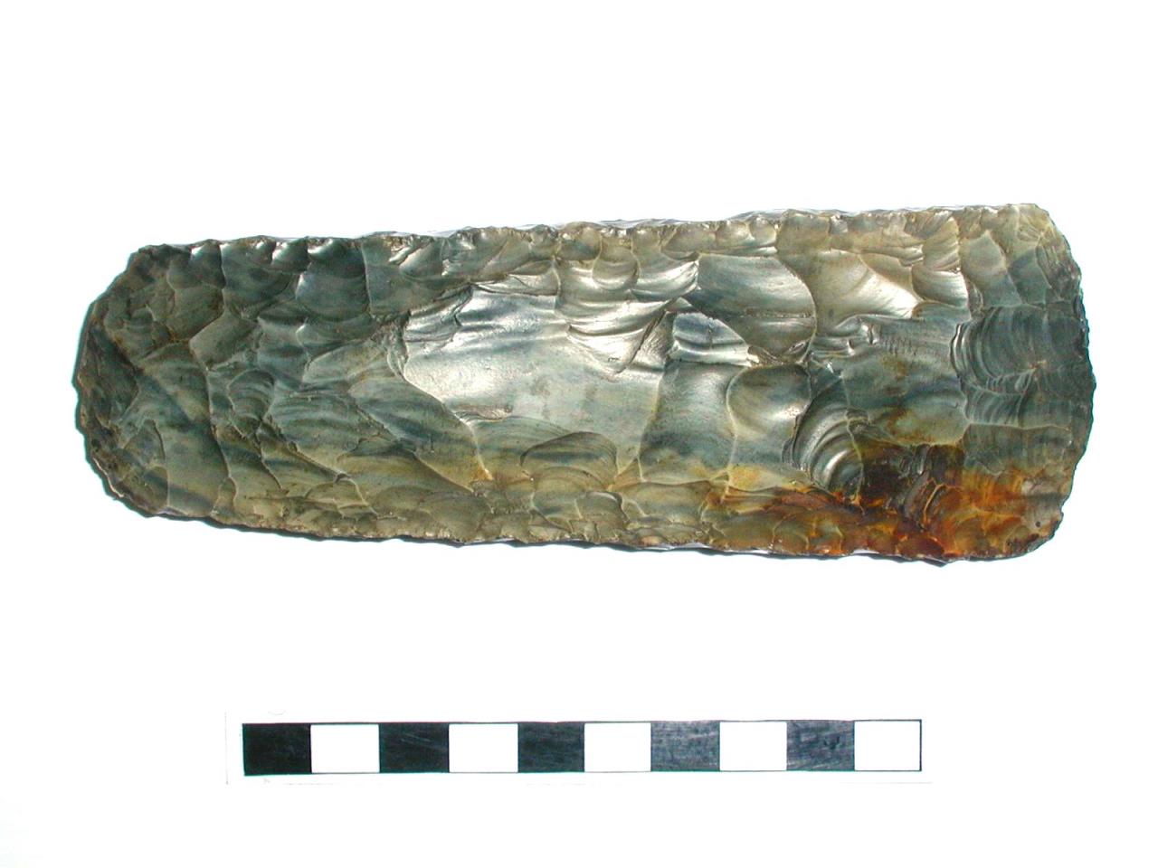- Straight sides tapering towards the butt; cutting edge curved; butt rounded; rectangular section. 'Scandinavian' type.