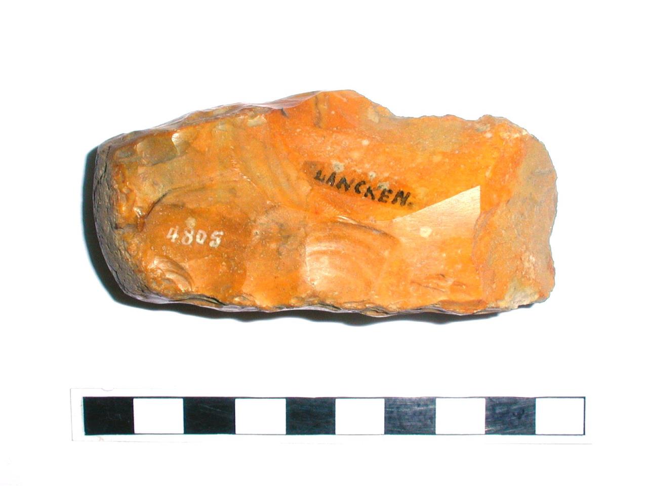 - Ground and polished axe fragment, reworked. Sides tapering towards the butt; cutting edge absent; butt rounded; rectangular section. 'Scandinavian' type.