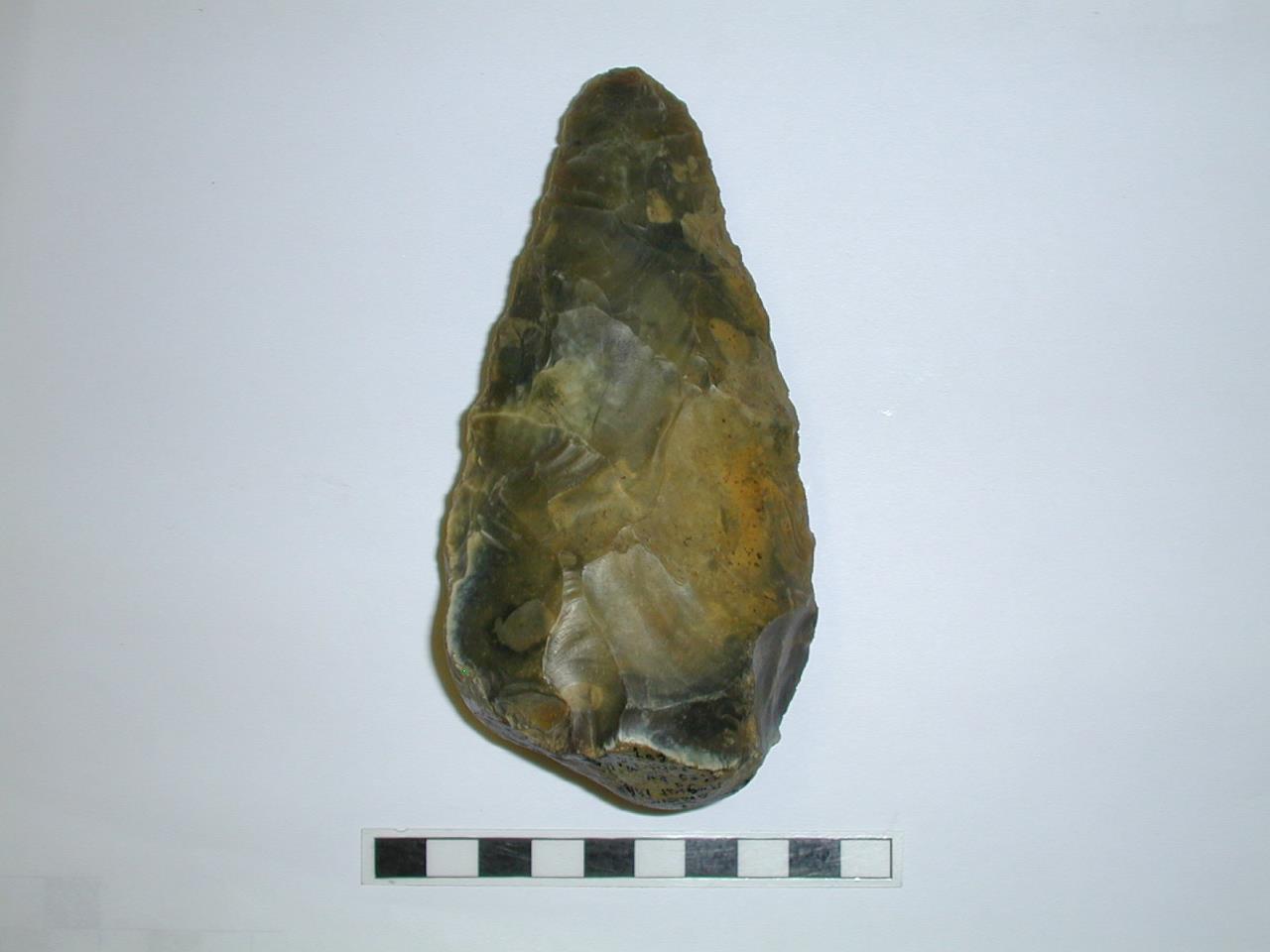 - Pointed handaxe, with bifacial flaking. Slightly rolled condition, with slight ocherous staining.