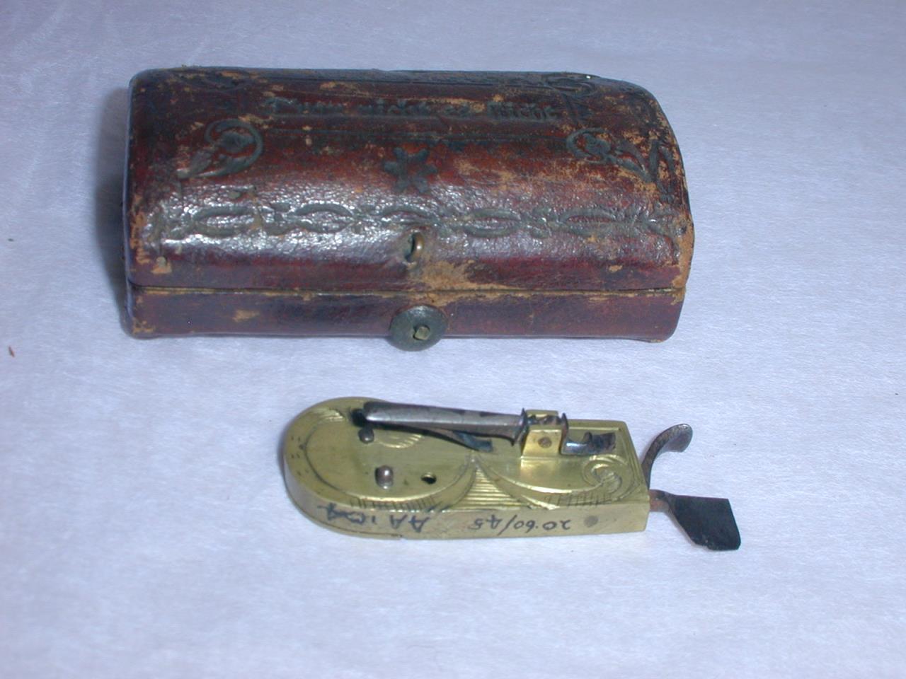- A scarificator in a tooled leather box with tooled border flowers and motto. The scarificator blades were released to make a seris of short cuts in the skin. These were used for bleeding (Warren page 16).