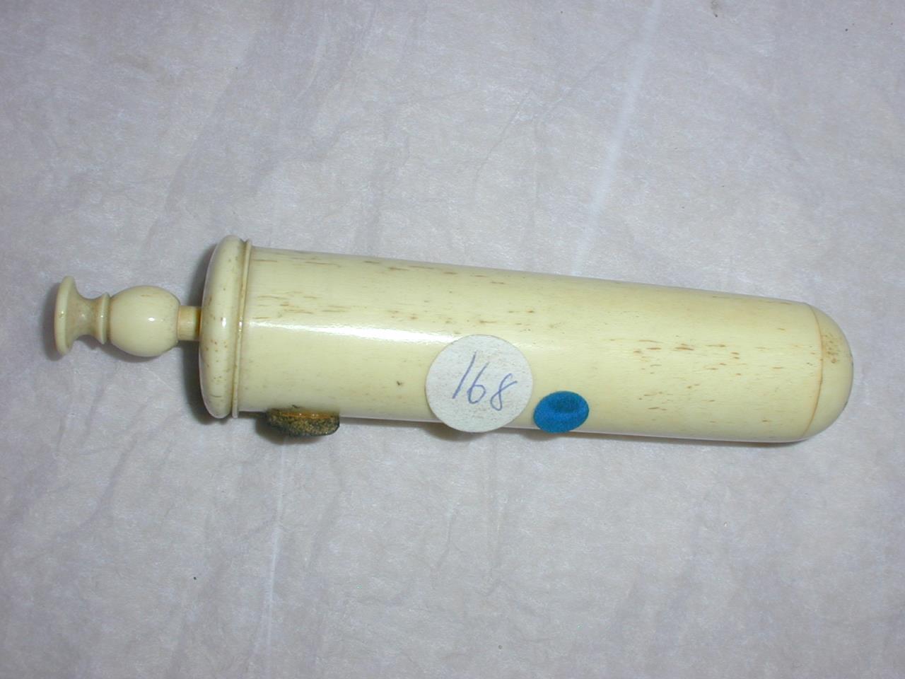 - An ivory syringe with five holes instead of a nozzle and a removable lid. The top of the plunger is carved.