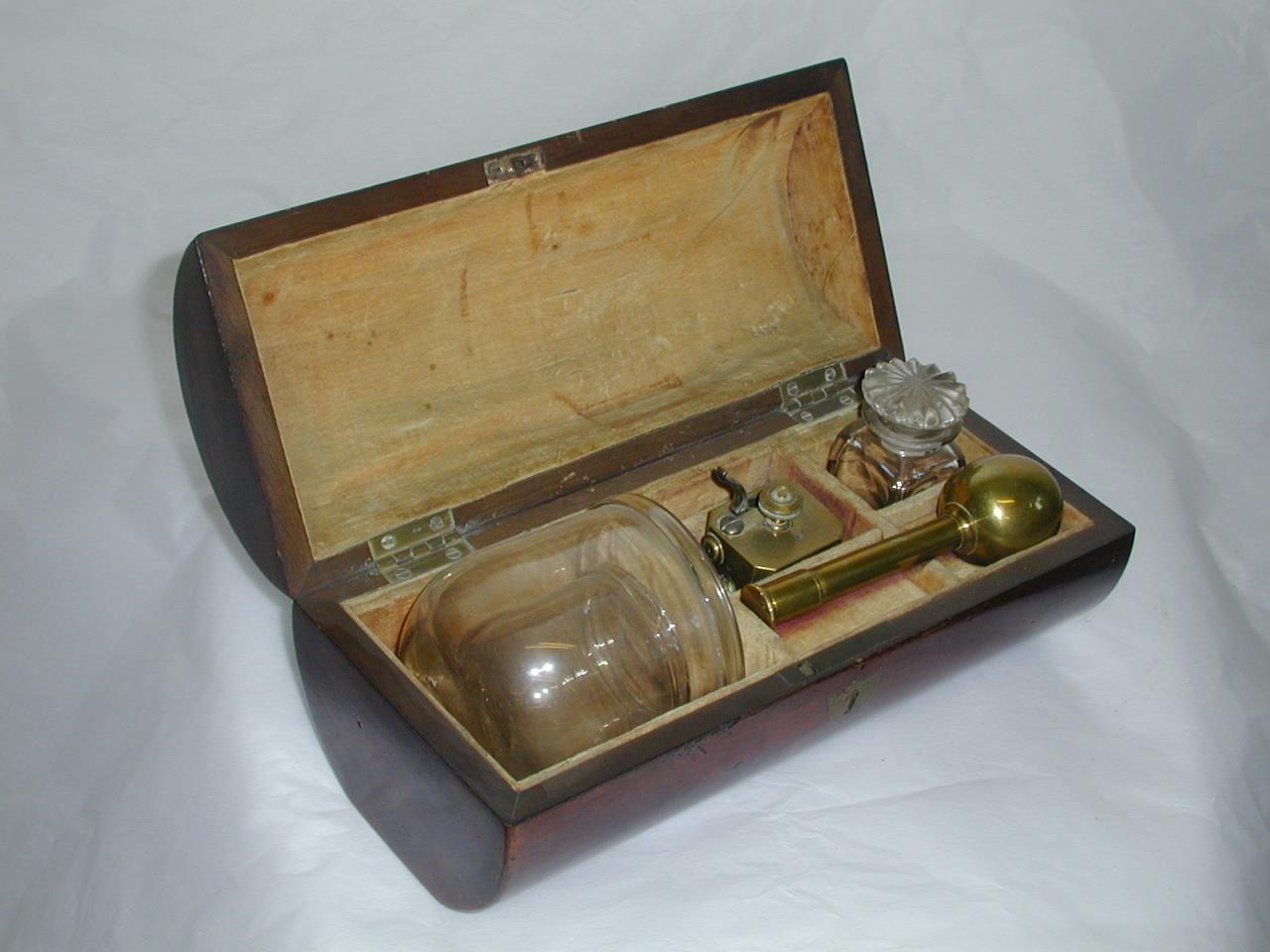 - A cupping set in a circular hinged mahogany case which is plush lined. It contains two glass cups one smaller than the other, a scarifier which is not original to the set, a glass bottle with stopper and a spirit burner.