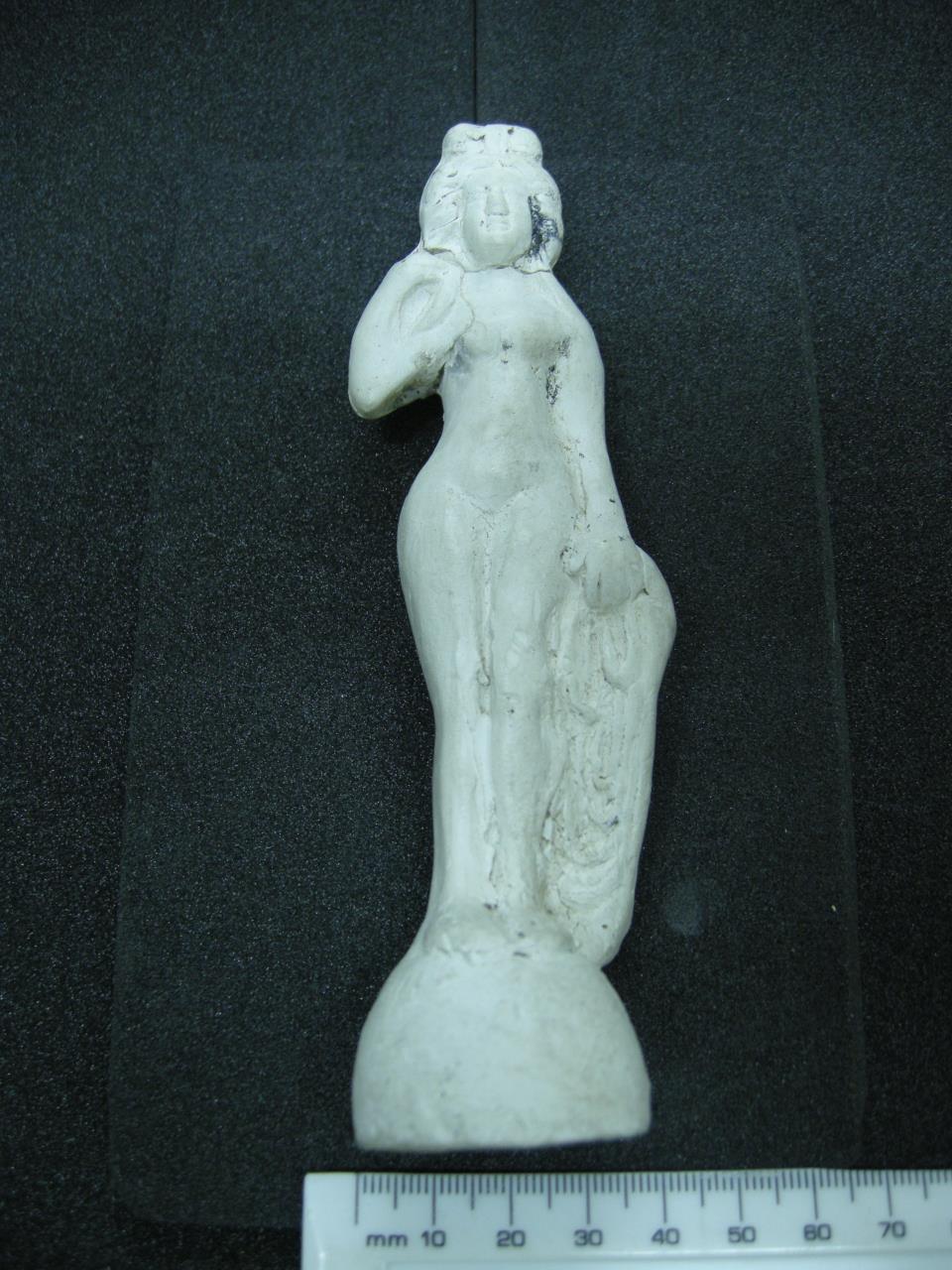 - In shape of Venus standing on a pedestal. She stands on a rounded base. Her hair is piled on top of her head and gathered at the back. Her right hand is brushing through the loose parts of her hair. Her left hand hangs by her waist and from it drapery falls. She has a wide nose and small eyes and a small mouth. She has a narrow waist, small breasts and wide hips. The folds of the drapery are cruder at the back of the figure. Her feet are little more than slipper shapes with faint lines to suggest toes.