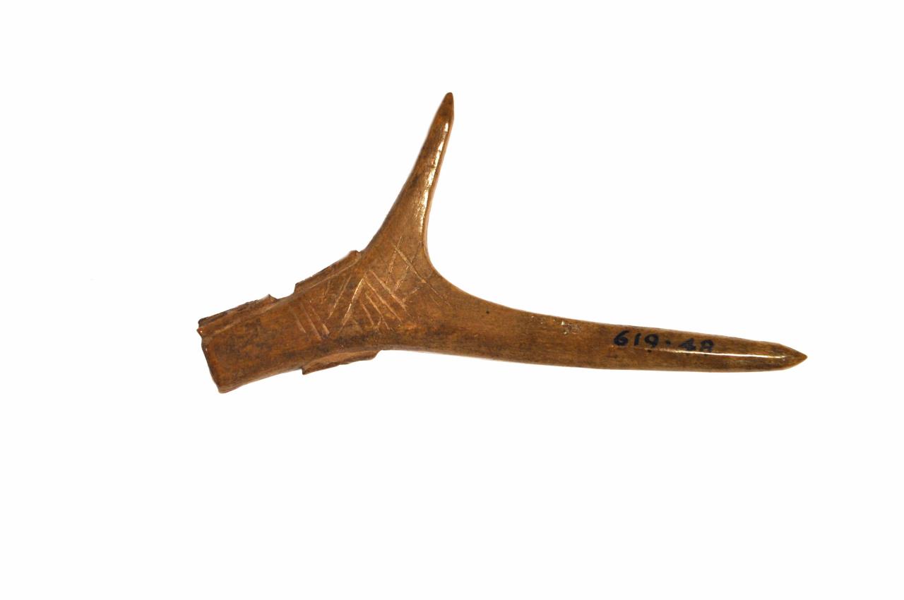 Y shaped with animal heads on the sides, incised decoration. Waterman 1959 describe sit as "cut from antler, perforated through the broadest part... obliquely from side to side... [it] bears on one face a double groove, following the outline of the object, filled with hatched lines and similar hatching, crudely cut and lacking a border, on the other. Animal masks, paired in one instance, appear on the sides. These objects are called pendants without prejudice as to their actual use. Evidence of wear at the perforations suggests that they were intended for suspension and the decorated examples may indeed have been worn as ornaments. The distincitive shape, however, suggests that they may have been put to some practical use at the same time..." Possibly a lucet. See YORYM : C668 and YORYM : C667 for similar examples.