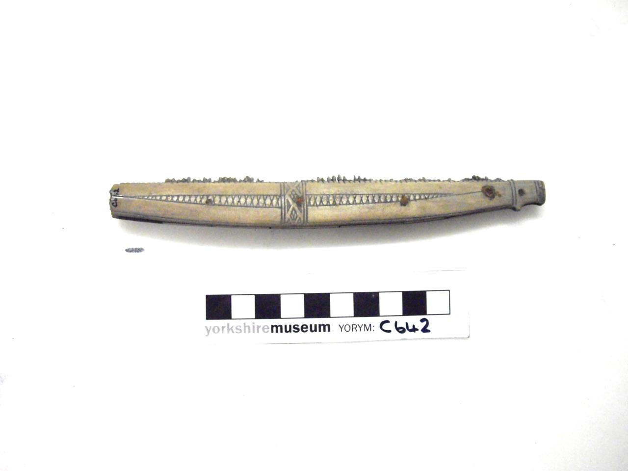 Single-sided composite comb. Animal head at one end, criss cross incised decoration. The incised decoration is contained within a panel along the length of the comb, except for a band lying vertically across the middle of the comb. The teeth only survive as stubs. Five iron rivets survive. Waterman 1959 illustrates but does not describe it.