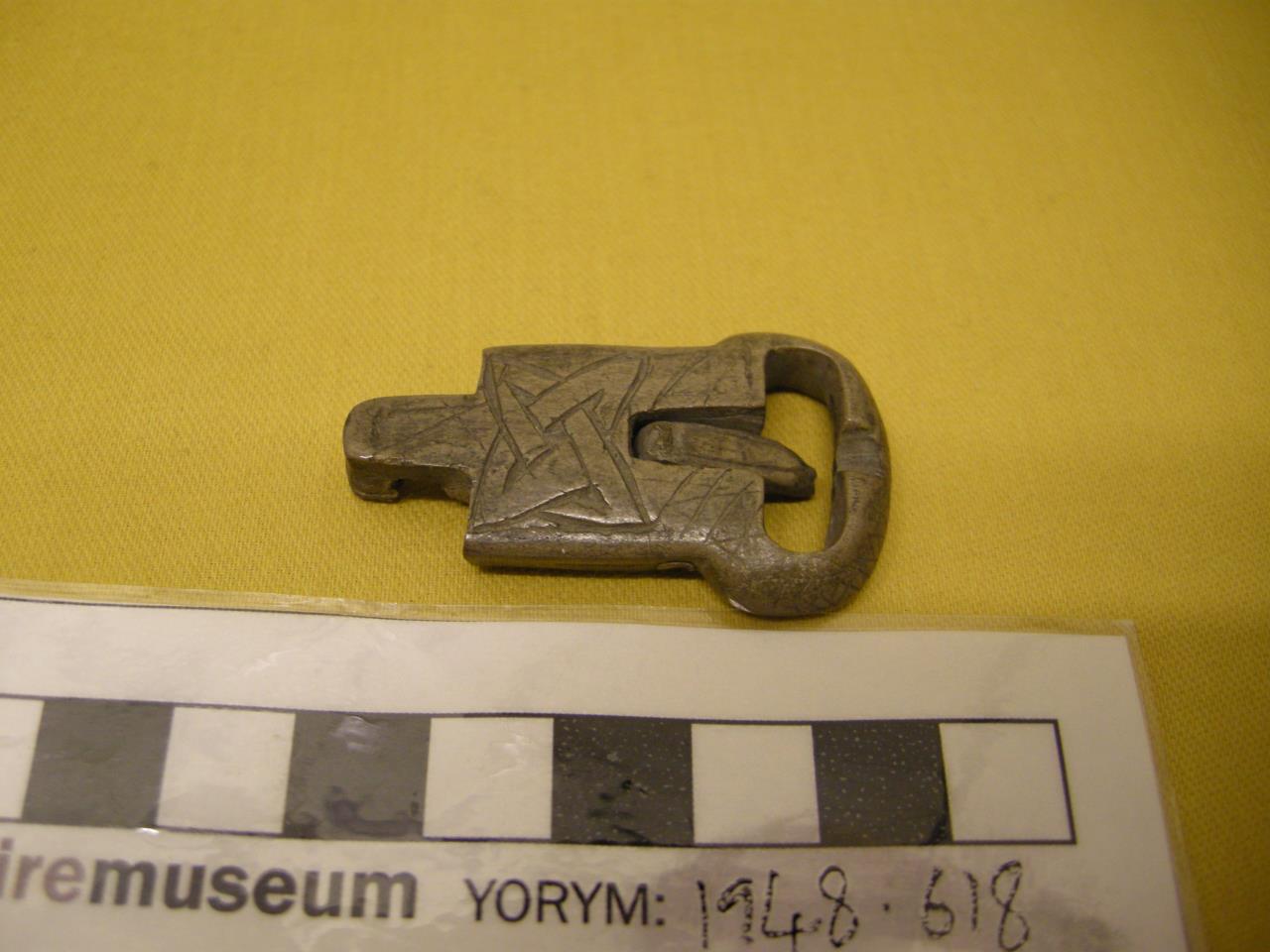 Bone buckle with incised interlace pattern on buckle plate. Description and illustration (figure 19.6) in Waterman 1959, pp. 91-92: 'Both [buckles] are cut from a single piece of bone, in one case with a separate tongue which rotates on a pivot of the same material. The method of attachment to the belt differs. The complete example, with an engraved interlaced knot on the plate, is provided with a notched projection to pass through a corresponding hole cut in the material of the belt.'