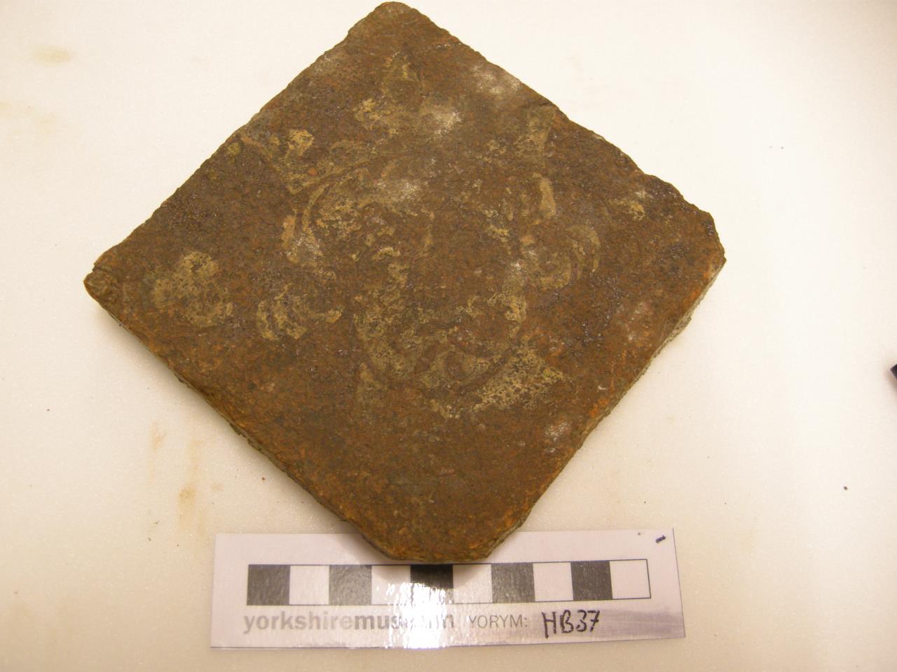 - Decorated, glazed. Described in Harvey Brook's unpublished catalogue as "A nearly perfect floor tile. Yellow decoration on a black ground. A King's head crowned and vested, long flowing curling wavy hair on either side of the head. A three leafed flower fills the space occupied by the diagonal setting out on the square of the tile. The face is that of one of the Plantagenet kings." The tile is much worn and the design is very faint now.