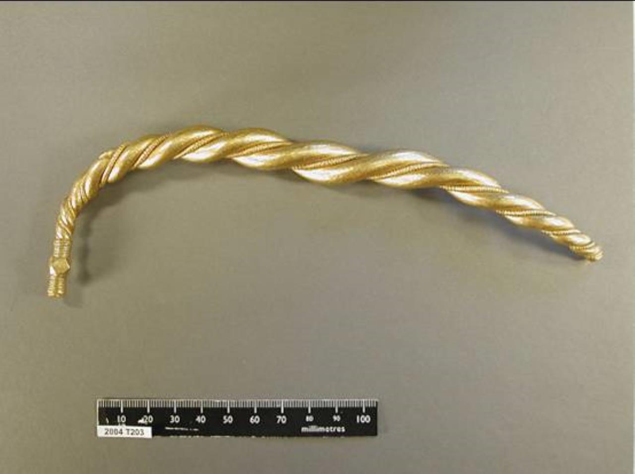 The ring has been cut through and partly straightened into a curved L-shape, but is otherwise complete; length, 260 mm (total); diameter, 15 mm at centre and 6 mm at ends. It is made of two thick, round rods with beaded wires between them, twisted into a cable and tapering to the ends. The original ends (now together at one end of the cable because of the cut) are joined to a plain, polyhedral knob and are closely bound with plain wires on either side of it. The beaded wires of the cable show girth grooves round many of the ‘beads’, which were caused in manufacture. There is a deep cut in one side of the ring towards one end and a few small dents at other points along its length.