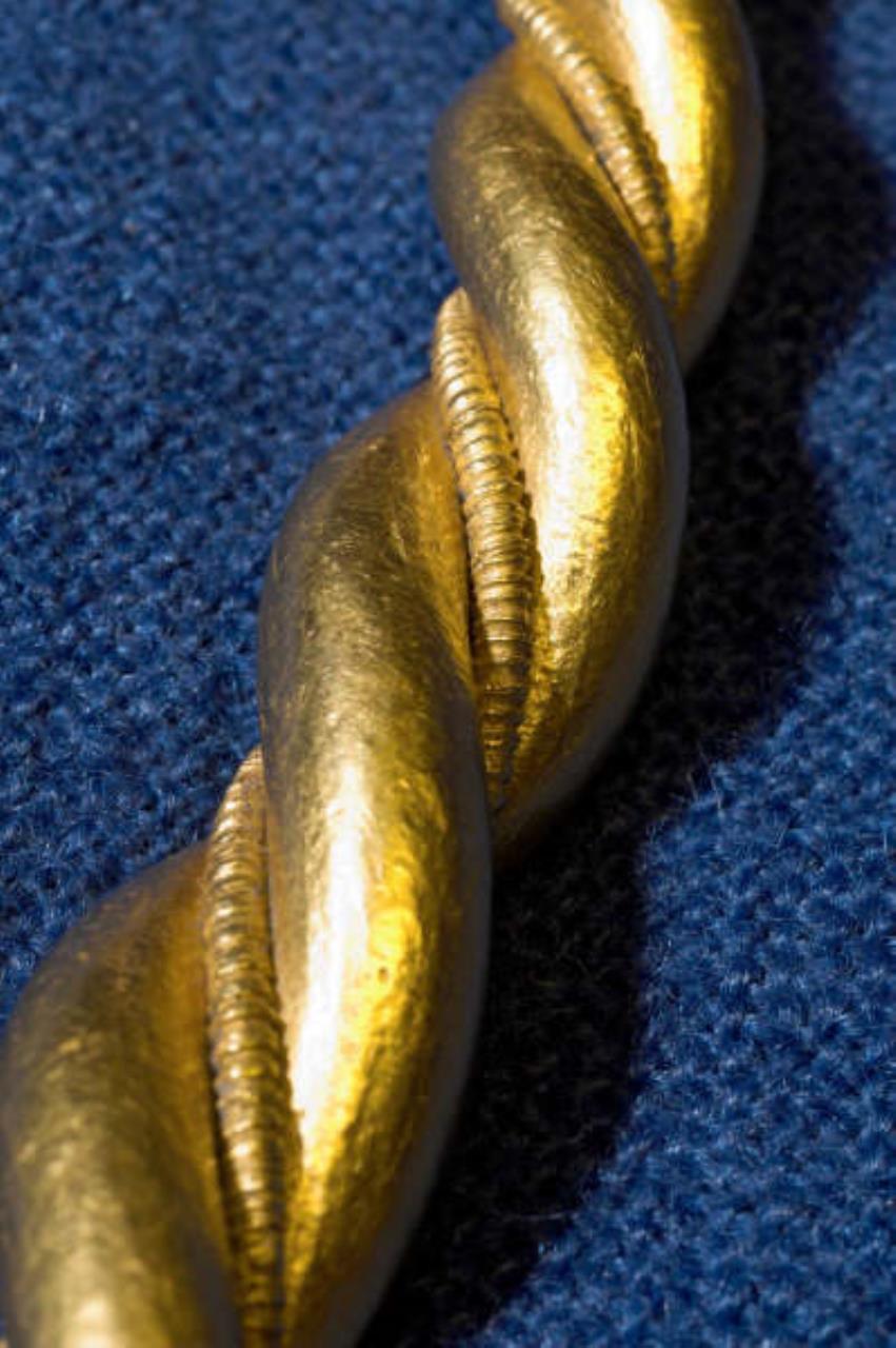 Surface metal analysis conducted at the British Museum indicated an approximate gold content for the armring of 95%; it weighs 324.6 grams.