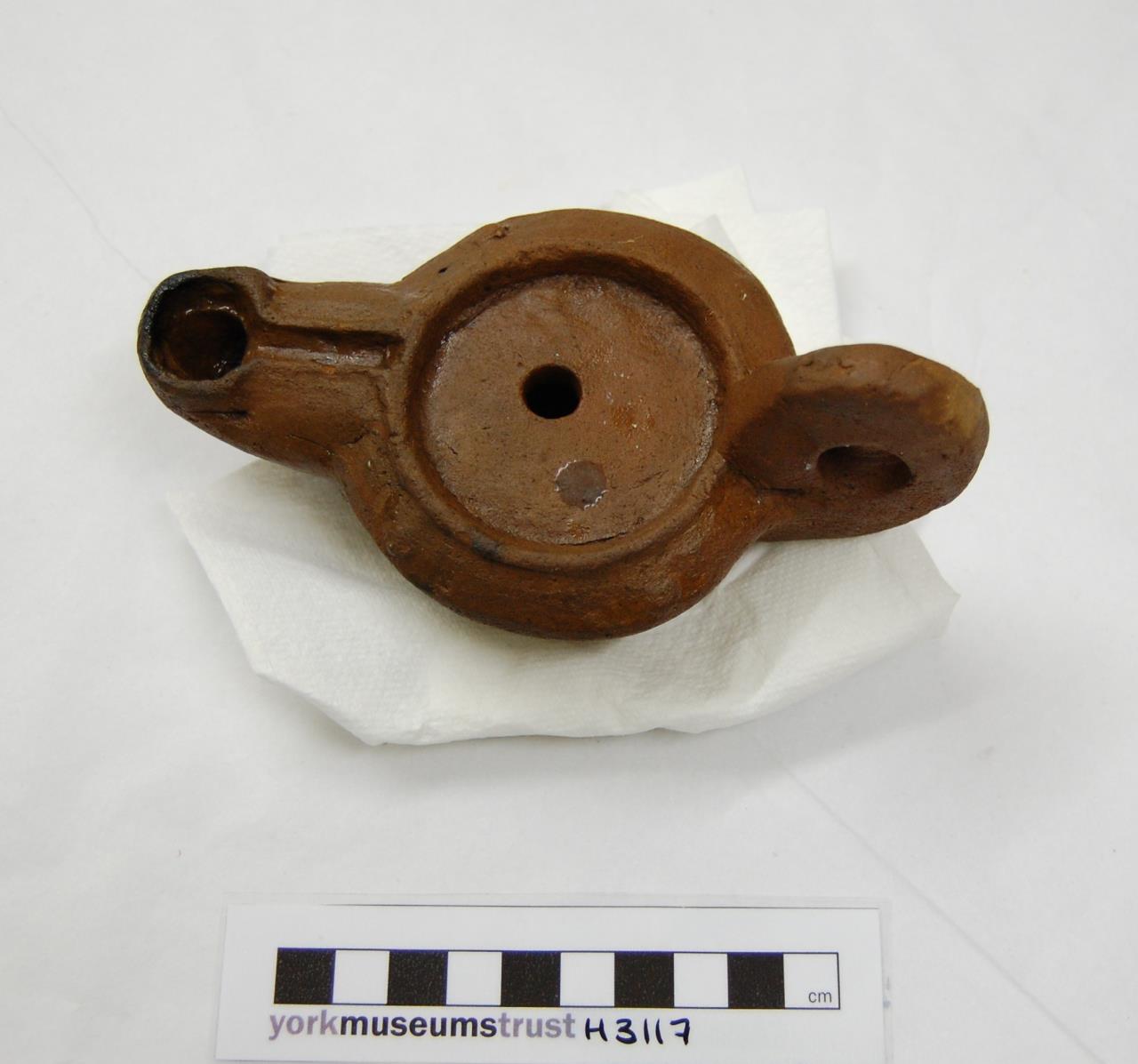 - Plain lamp with upright perforated handle. Sooting on rim of hole for wick.