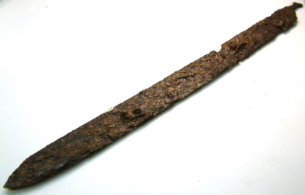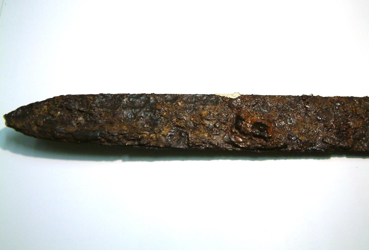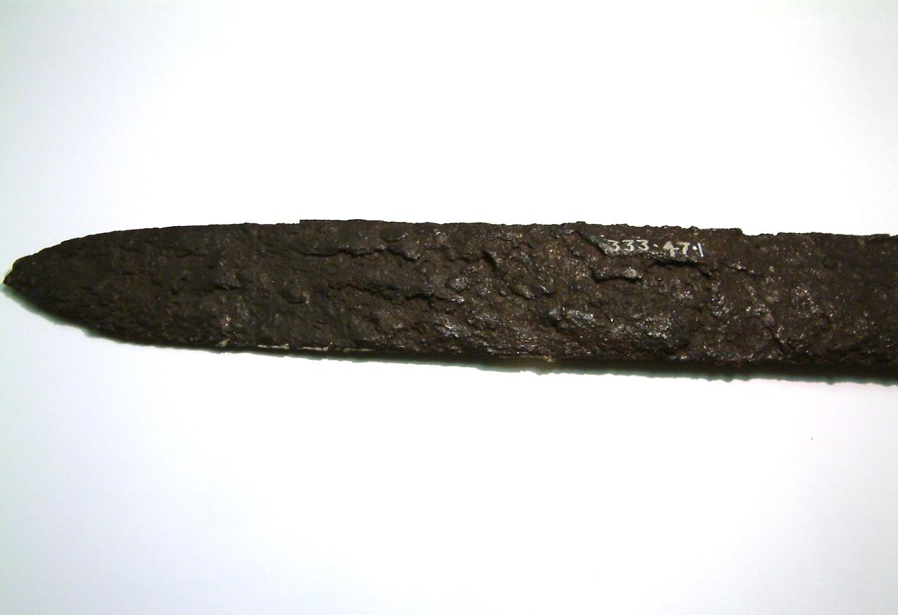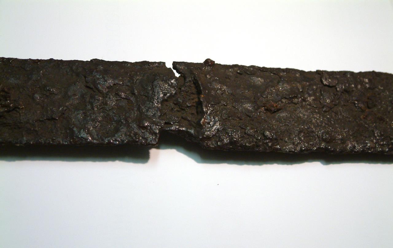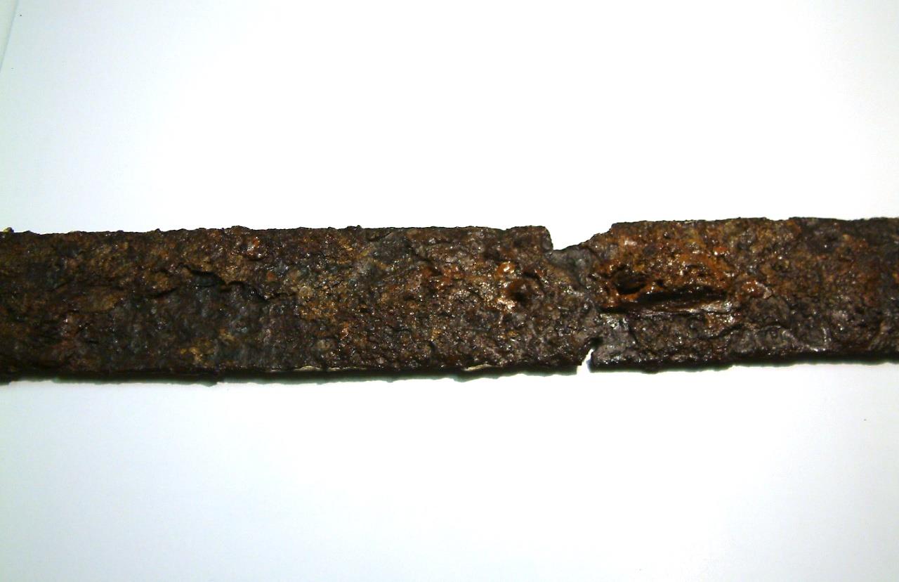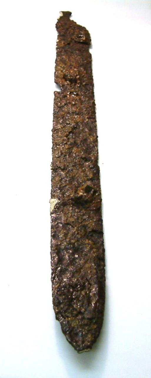 Two edged sword. The blade has been broken diagonally at the top leaving a small diamond of metal at the top, it is also damaged midway along its length. This fissure is visible on both sides of the blade and shows the core of the blade on one, the cutting edges of both sides are therefore missing. There is some damage other than this to the edges of the blade and its tip is missing. Along one face of the blade there are areas of raised orange coloured nodules, on the other side of the blade these are not so prominent. On both sides of the cutting edges however there is a white discolouration.