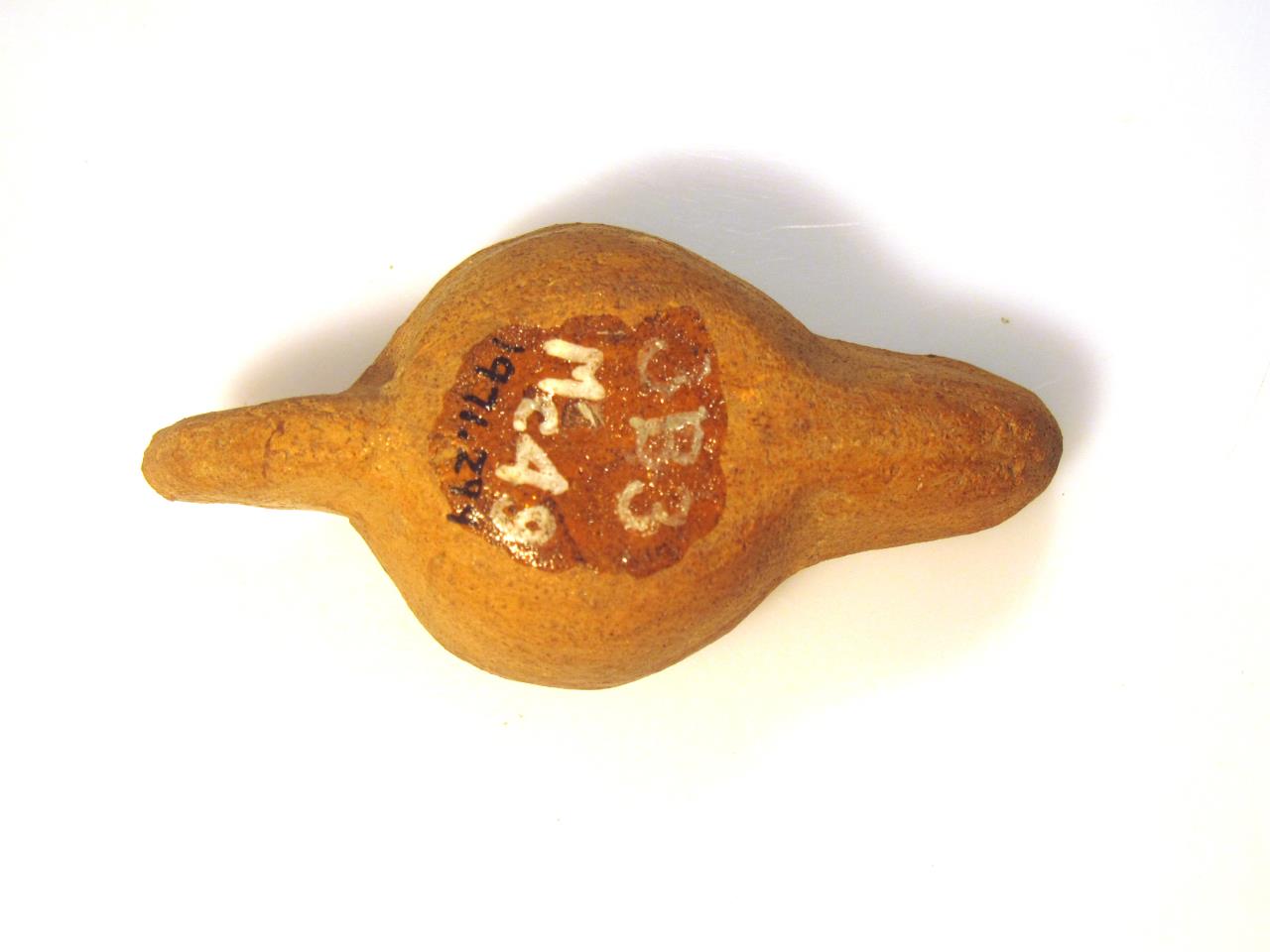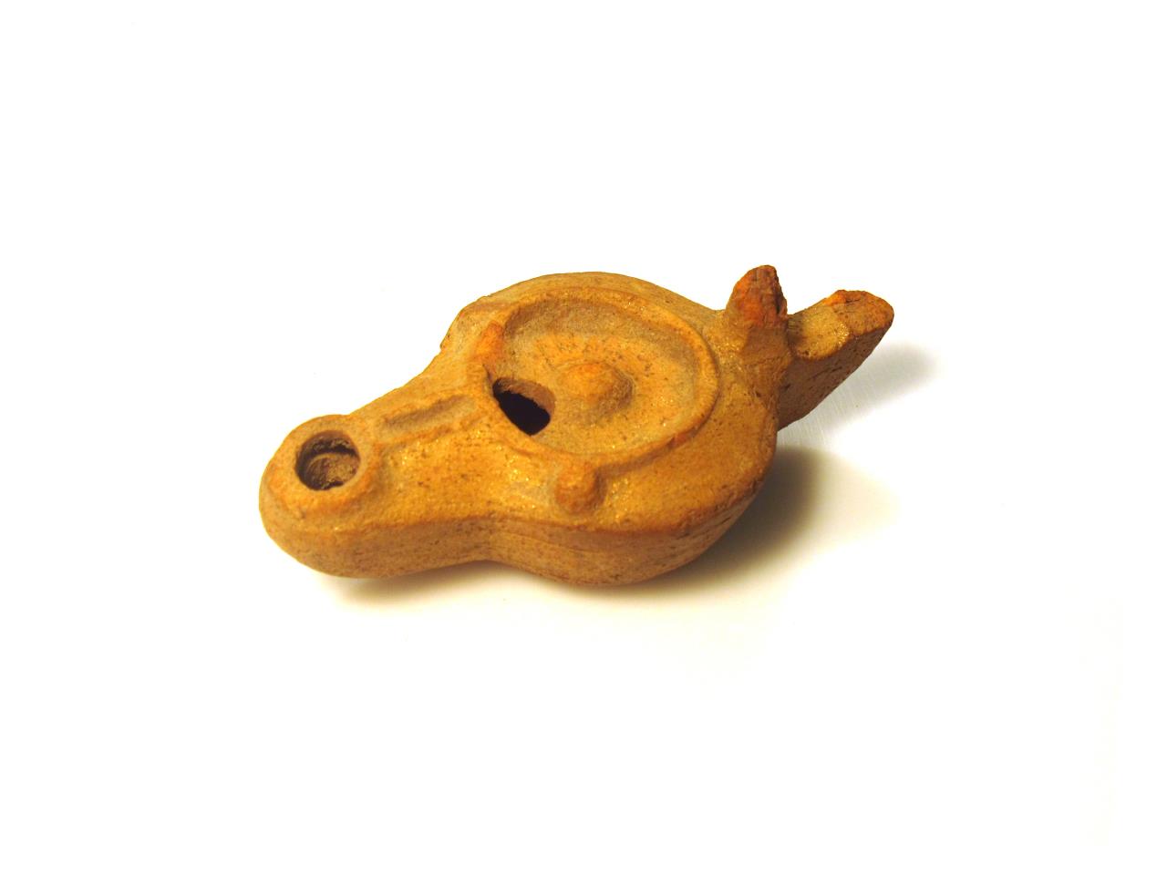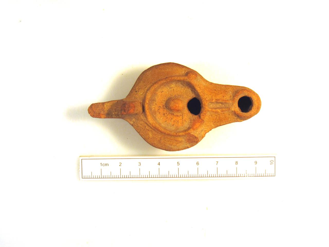 - Small ceramic oil lamp with moulded basin, and a central boss within it. The handle is broken. The fine orange clay is interspersed with muscovite mica; tiny gold-coloured flecks which are evident on the surface on all sides and give the lamp a glittering surface. Mica-Dusted Ware.