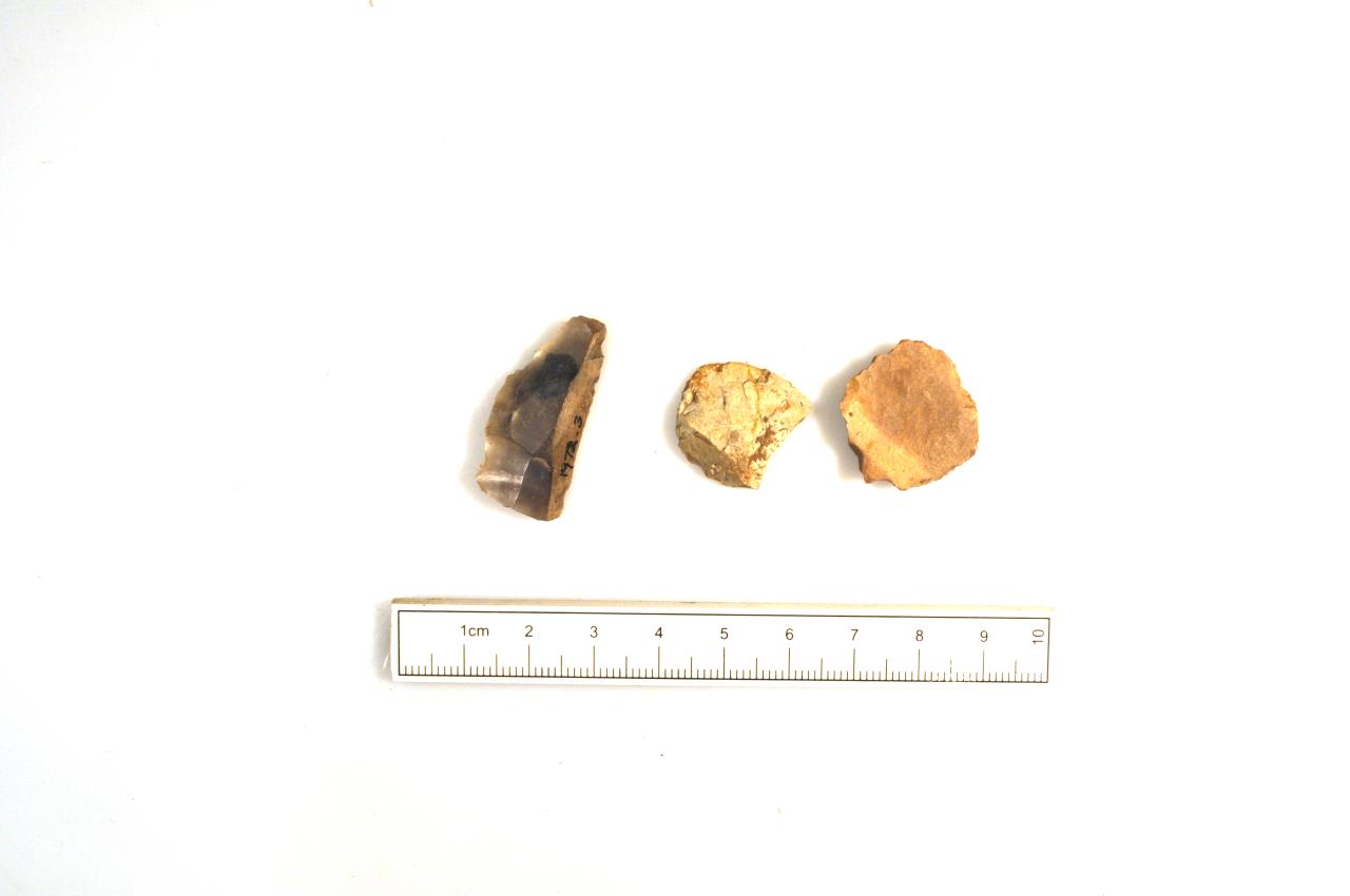 - One retouched flake, one discoidal scraper, one burnt scraper.